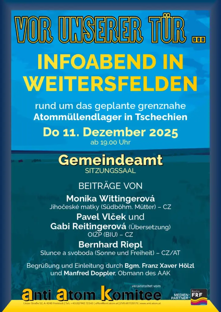 Als letzte Veranstaltung des Anti Atom Komitees für 2025findet am Donnerstag, 11. Dezember, ab 19.00 Uhr im Gemeindeamt in Weitersfelden statt.Gemeinsam mit